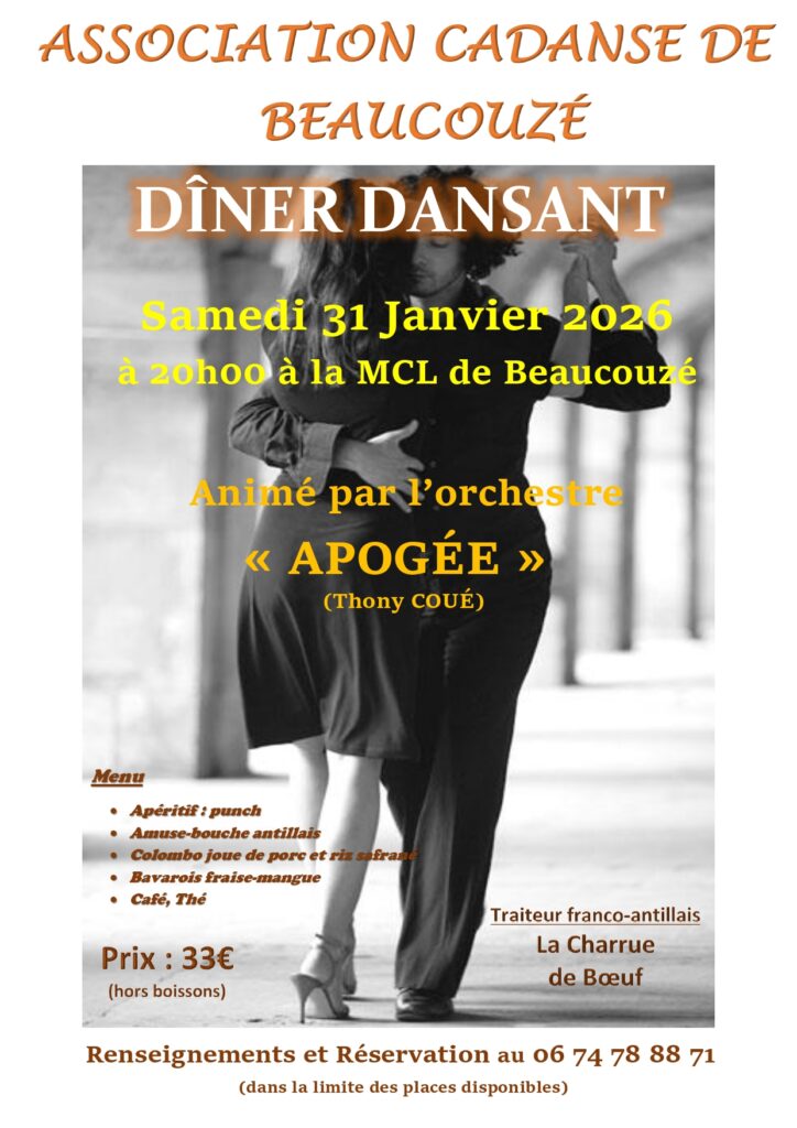 Samedi 31 janvier 2026 (date définitive) dîner dansant CADANSE à la MCL de Beaucouzé animé par l’orchestre Apogée (Tony Coué), repas par le traiteur franco-antillais (La charrue de boeuf).